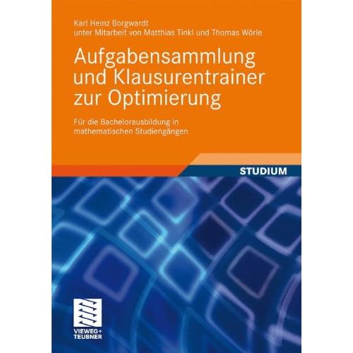 Pressestimmen "Die vorliegende Aufgabensammlung ist umfangreich, das gesamte Themenfeld ist umfassend, sehr übersichtlich und perfekt an die Ansprüche des Studiums angepasst. Man kann an jeder Stelle des Buches einsteigen und findet sich sofort zurecht. Es eignet sich damit prima für Studenten, die Vorlesungsstoff aufarbeiten und sich auf Prüfungen vorbereiten möchten. Aber auch für Dozenten ist das Werk eine wertvolle Hilfe bei der Erstellung von Übungszetteln und Klausuren." www.math.uni-rostock/rho, 08.06.2010 Werbetext Das Übungsbuch zum kompletten Bachelorwissen in "Optimierung" Alle ProduktbeschreibungenTaschenbuch=424 Seiten. Verlag=Vieweg+Teubner Verlag; Auflage: 2010 (27. Oktober 2009). Sprache=Deutsch. ISBN-10=3834808784. ISBN-13=978-3834808783. Größe und/oder Gewicht=17 x 24 cm. Durchschnittliche Kundenbewertung=Schreiben Sie die erste Bewertung. Amazon Bestseller-RangSpieltheorieRechnungswesenAbstrakte Algebra=Nr. 611.246 in Bücher (Siehe Top 100 in Bücher) .zg_hrsr { margin: 0; padding: 0; list-style-type: none; } .zg_hrsr_item { margin: 0 0 0 10px; } .zg_hrsr_rank { display: inline-block; width: 80px; text-align: right; } Nr. 99 in Bücher > Fachbücher > Biowissenschaften > Evolution > Nr. 100 in Bücher > Business & Karriere > Bilanzierung & Buchhaltung > Nr. 105 in Bücher > Fachbücher > Mathematik > Algebra & Zahlentheorie >.